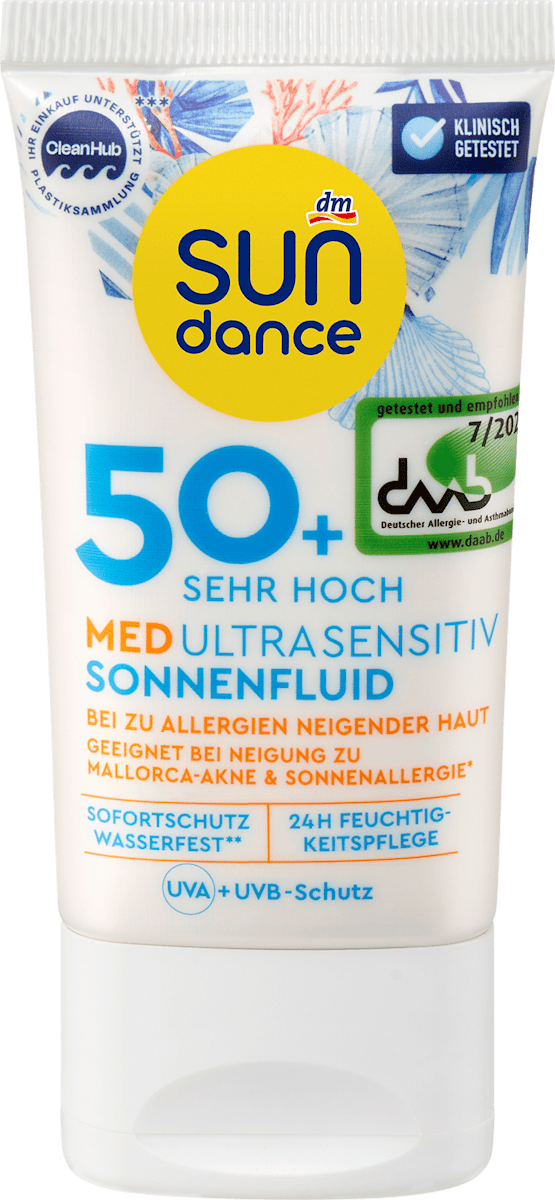 • SUNDANCE Sonnenfluid Gesicht MED Ultra Sensitiv LSF 50+ – Wasserfest, geeignet für Neurodermitiker und für zu Allergien neigender Haut. Um € 4,95 bei dm.